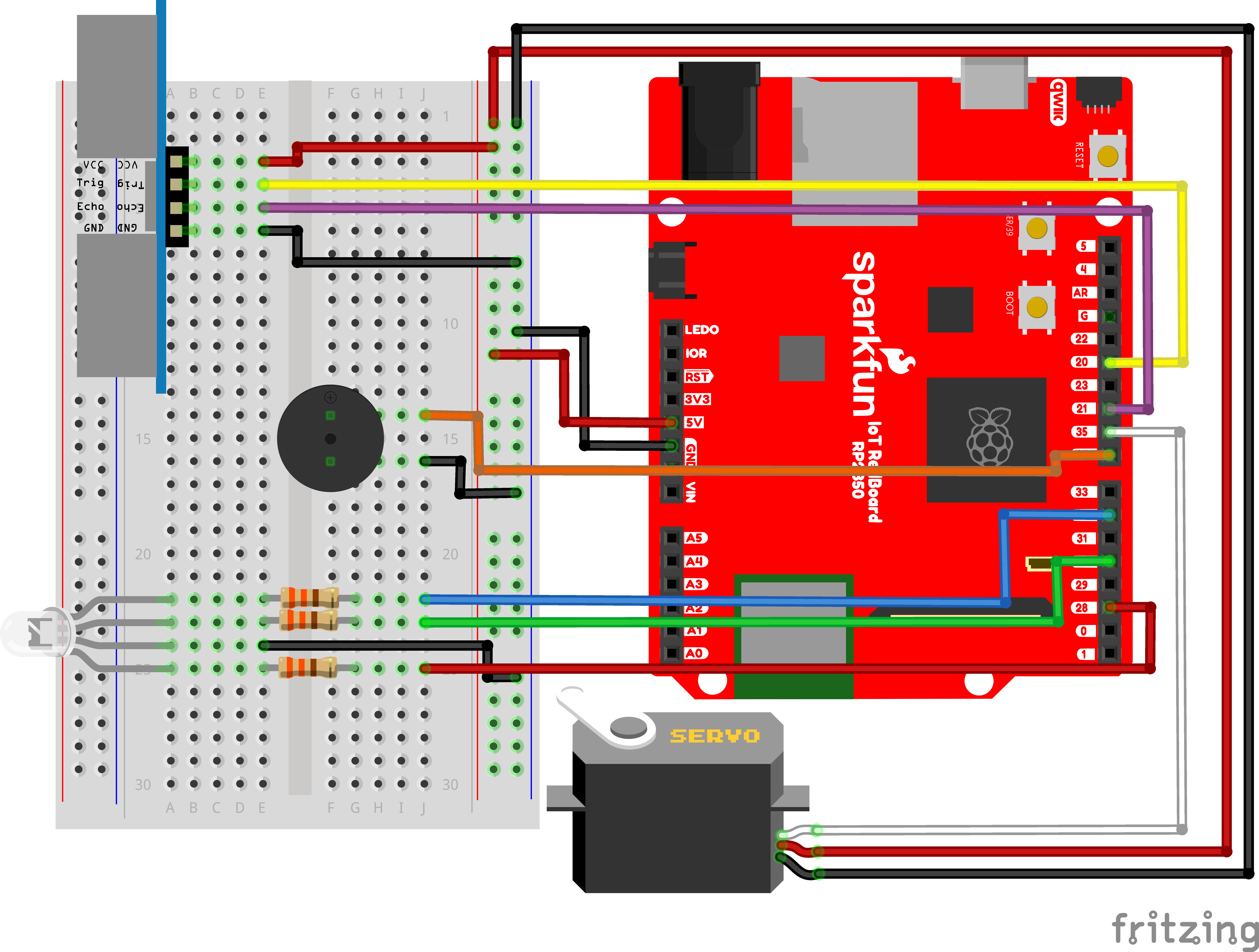 The RGB LED will behave as in your last circuit. It will be green when objects are far, yellow when they are midrange and red when they are close. When an object is close the buzzer will also beep, and the servo will rotate back and forth.